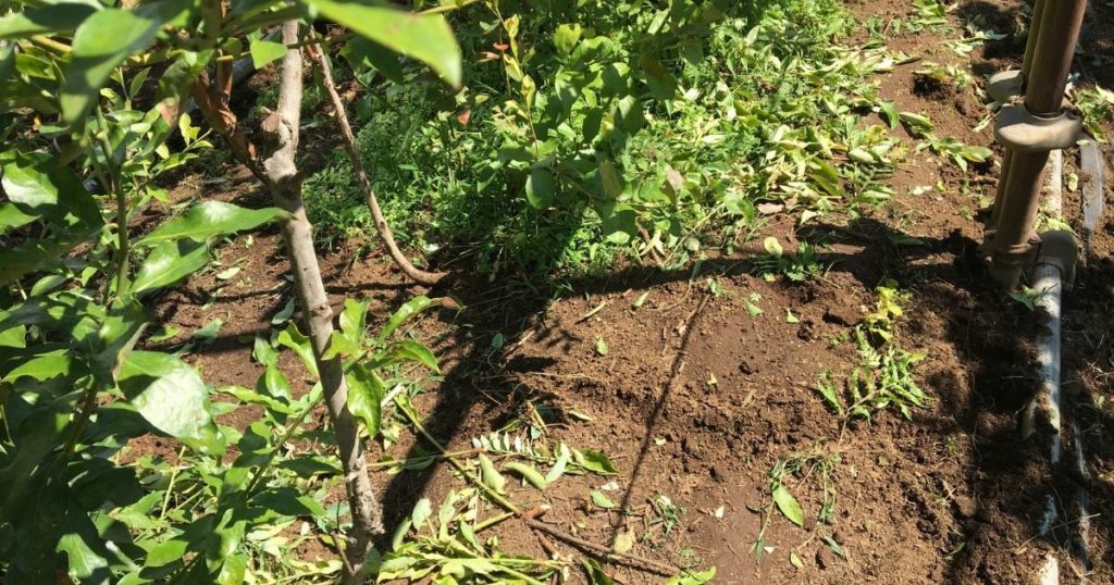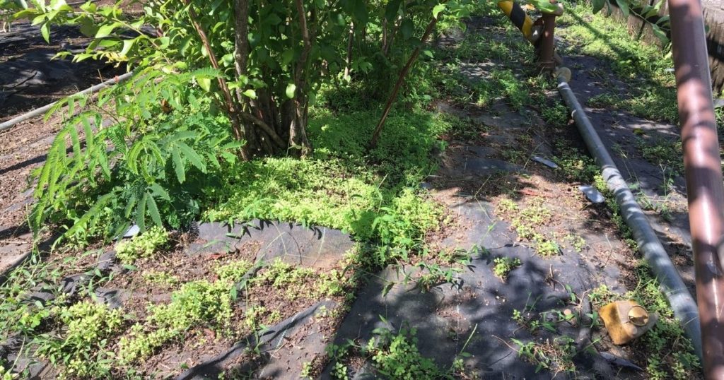 今、畑の一角で4,5本の樹を育てていますが、地面は雑草対策のために除草シートを貼っていました(もう何年もこの状態)。