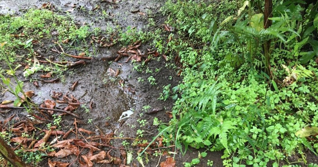とりあえず、雨水の通り道として、表層から5cmほど水脈を移植ゴテで掘っておきましたが、ちゃんと雨水の流れ道にはなっているようです。