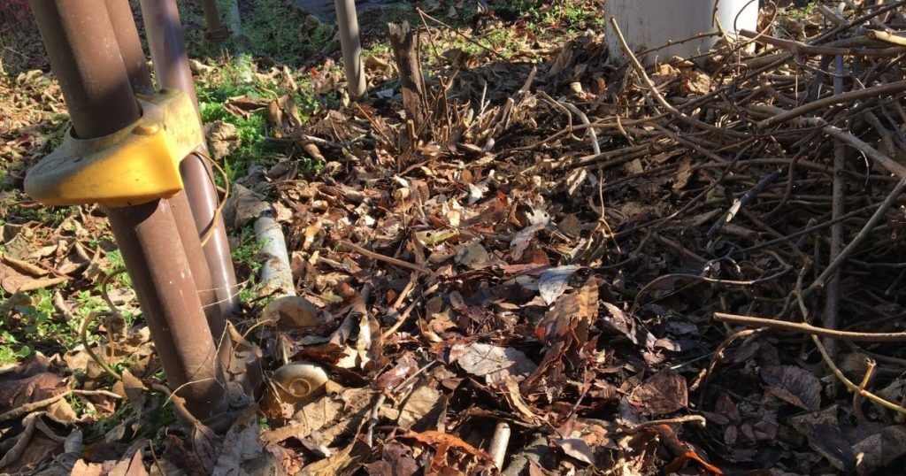 12月初旬に竹林整備したときもらってきた竹と、実家付近の山道で拾ってきた枝木・落ち葉を使って、ブルーベリーエリアからコンクリート壁の隅のところまで。