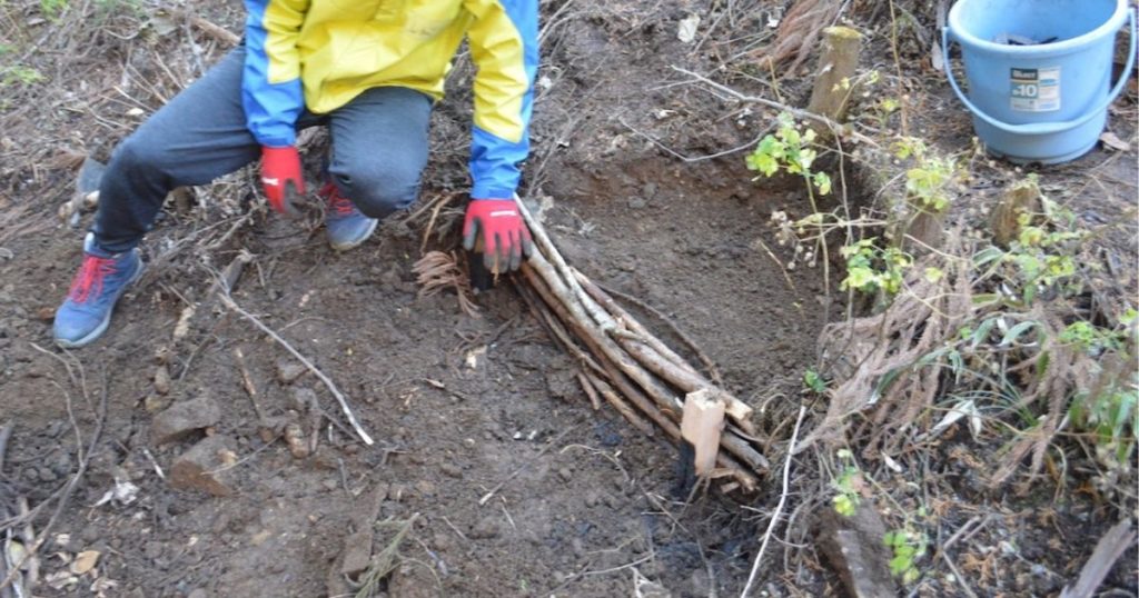枝木と落ち葉、炭を使って階段を作るもの。